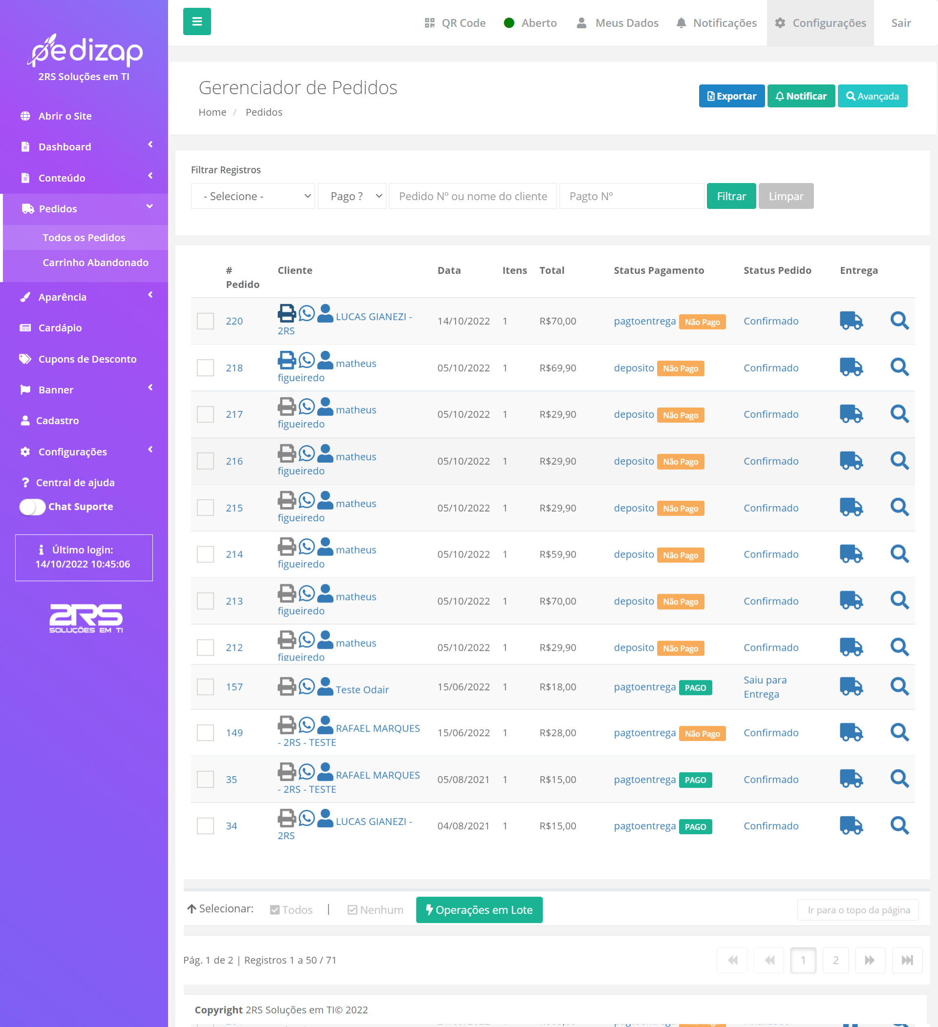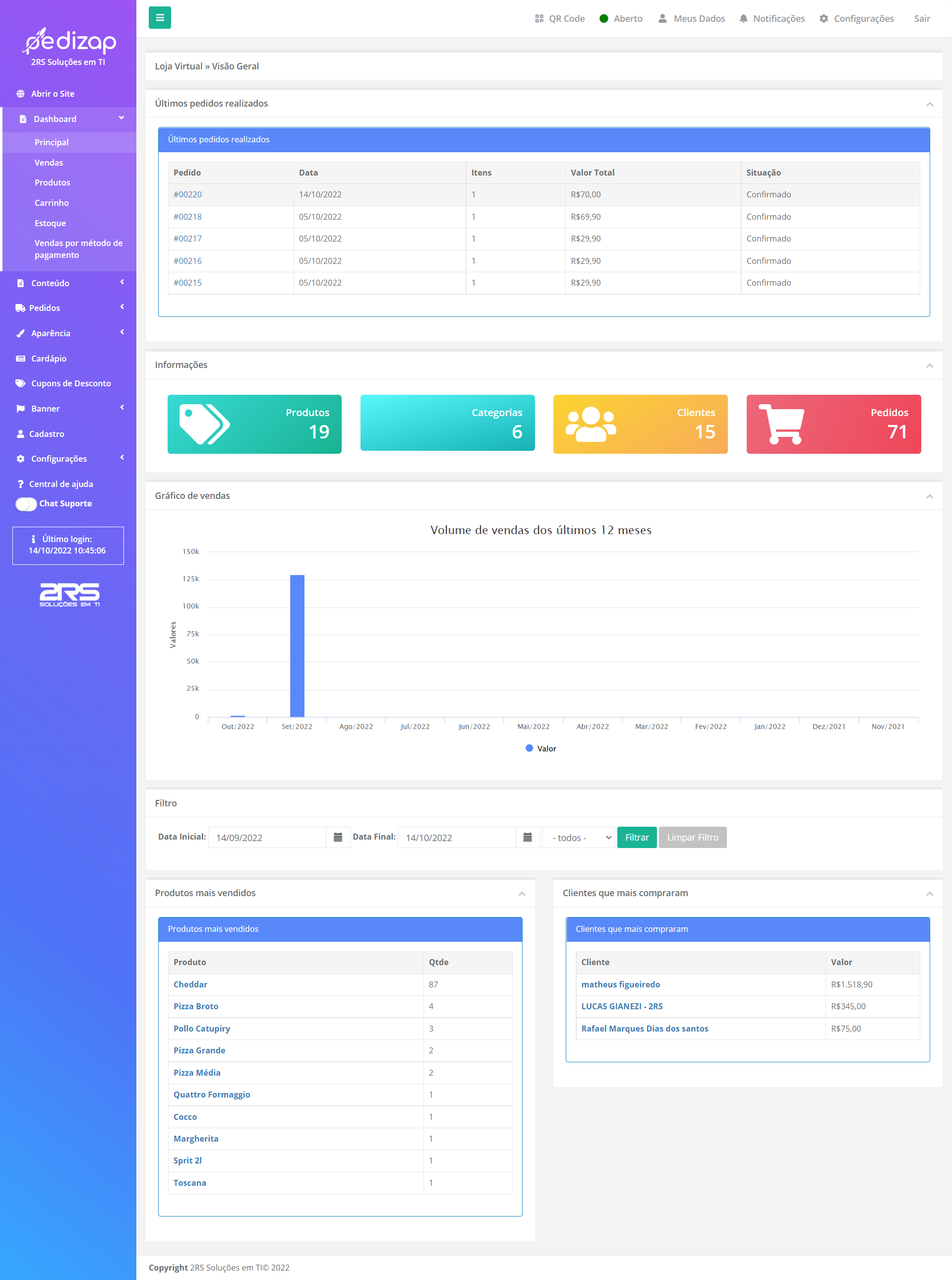 Você terá acesso a um painel com todas as informações que precisa, quantos clientes compraram no dia, no mês ou no ano, qual o seu melhor cliente, quantos produtos estão ativos no cardápio, qual foi o seu faturamento e ainda controlará os pedidos com status de andamento até a finalização da entrega.